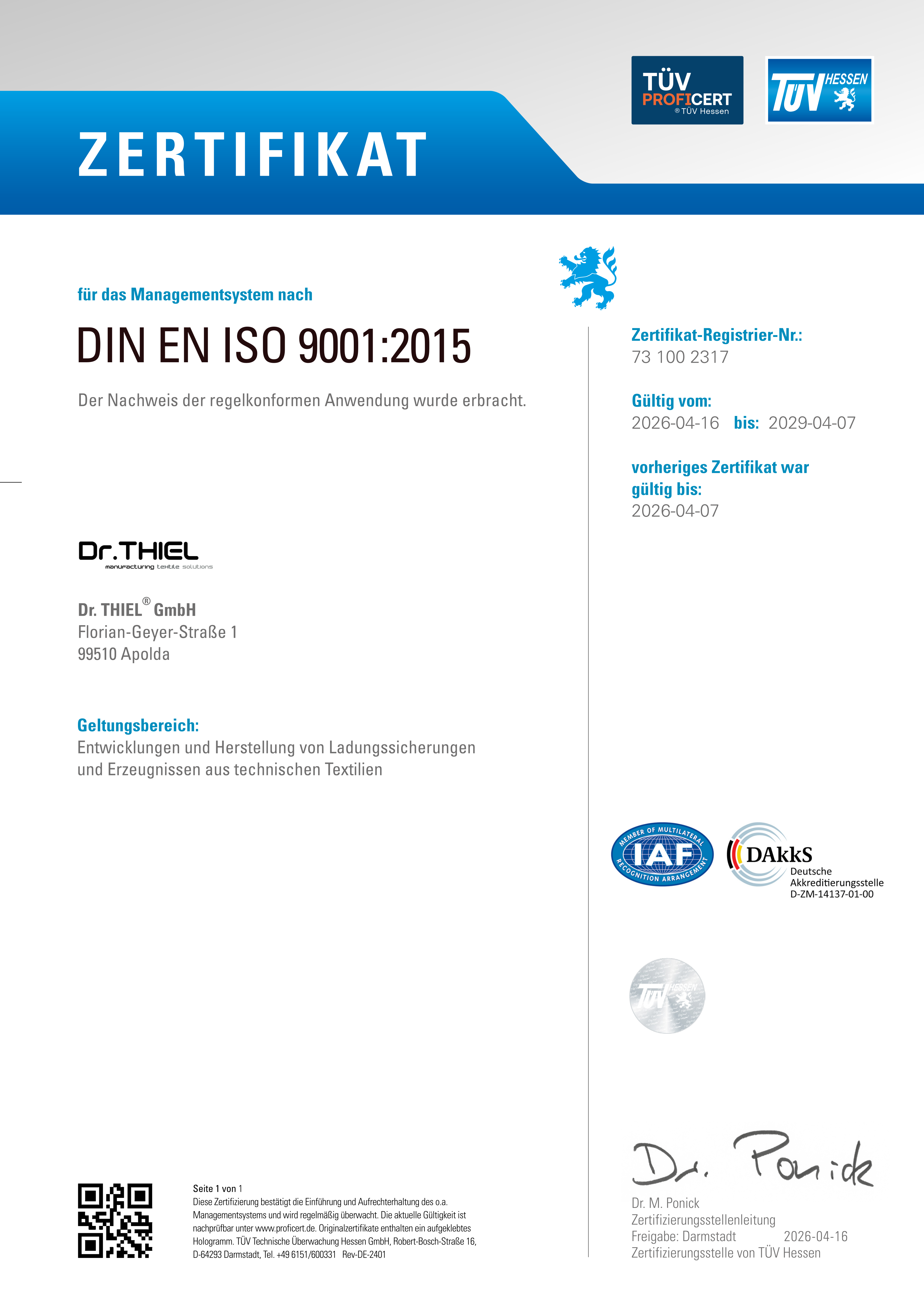 Zertifikat für das Managementsystem im Geltungsbereich Entwicklungen und Herstellung von Ladungssicherungen und Erzeugnissen aus technischen Textilien.