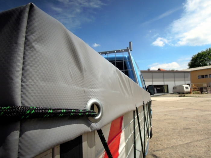 Hier sieht man eine individuell angefertigte Pritschenplane, als Maßanfertigung aus grauem PVC, welche wir für einen VW T5 Doka TDI Transporter (Pritsche, Doppelkabine) mit Stirnwandschutz gefertigt haben. Die Aussparrung für den Stirnwandschutz (Lastenträger/ Leiterträger) wurde hochwertig und praktisch gelöst. Diese neue deckelförmige PVC-Pritschenplane hat schon ausgeformte Ecken für eine exakte Passung am Fahrzeug. Sollten Sie Sonderwünsche bzgl. der vorderen Ausführung der Plane (Aussparungen für Geweihe, Drehverschlüsse etc.) haben, kontaktieren Sie uns bitte VOR der Bestellung.